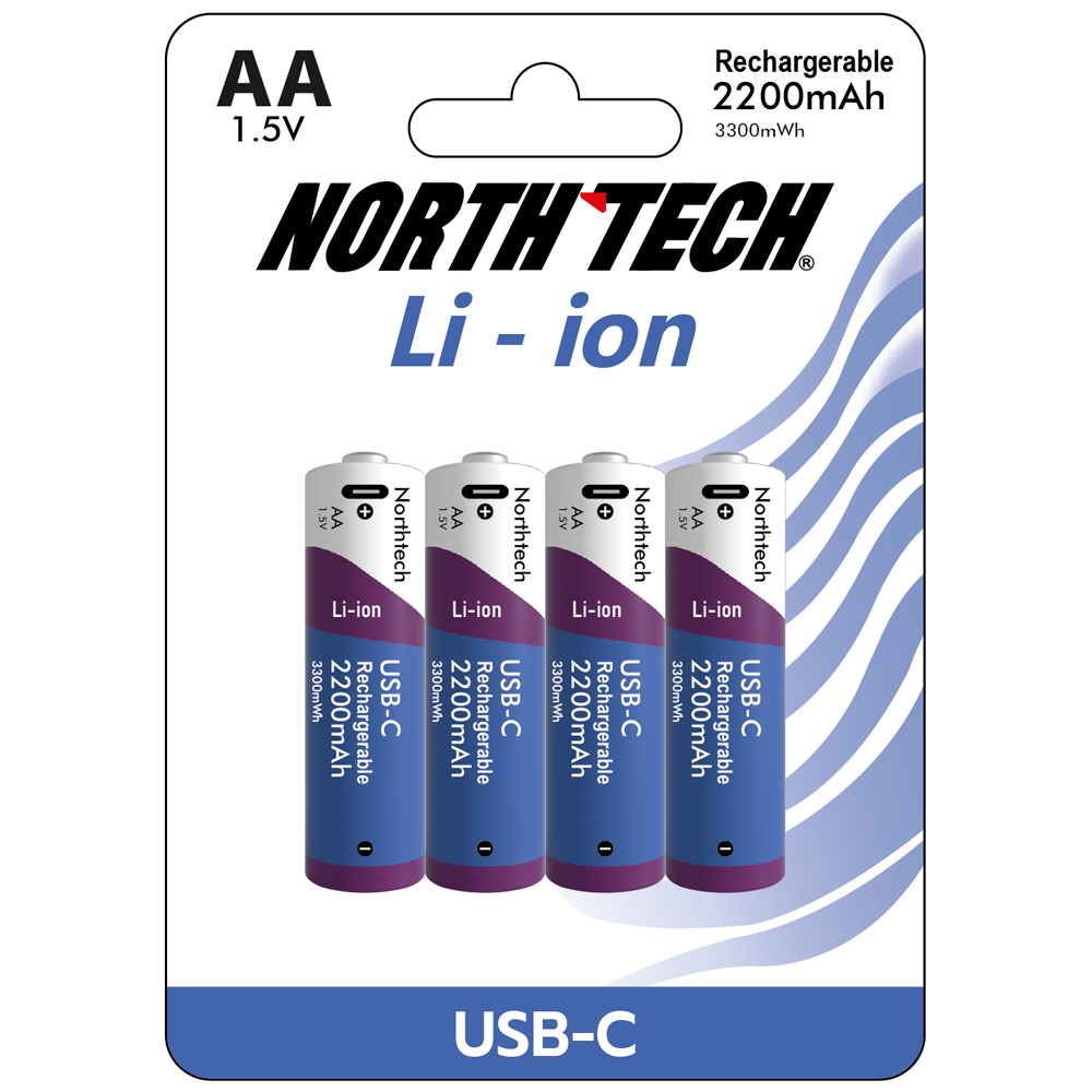 North Tech AA Li-ion USB-C rechargeable batteries combine innovation and convenience for demanding users. With 2200mAh (3300mWh) capacity, these high-performance batteries deliver a consistent 1.5V output, ensuring stable performance across a wide range of electronics. Thanks to the integrated USB-C charging port, there’s no need for a separate charger – simply connect and recharge quickly, anytime.